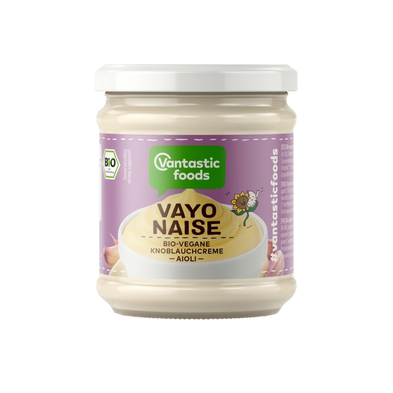 Lahodná Vayonaise, zušlechtěná chutným česnekovým aioli, je dokonalou, čistě rostlinnou alternativou majonézy. Chutná nejen lehce a pikantně, ale finální šmrnc dodá i bramborovému salátu, těstovinovému salátu nebo chlebíčkům. Vydatné omáčky a fantasticky krémové dipy pro svačiny a rychlé občerstvení lze s Vayonaise také rychle připravit, což z něj dělá nepostradatelnou, všestrannou přísadu pro všechny druhy pokrmů. Tento krém je nutností pro vegetariánskou a veganskou kuchyni!