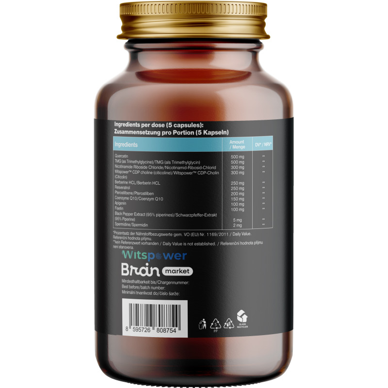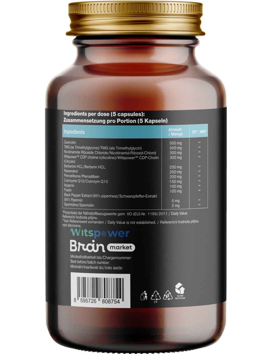 Složení: kvercetin (500 mg, RHP **), trimethylglycin (500 mg, RHP **), nikotinamid ribosid chlorid (300 mg, RHP **), CDP cholin (citikolin) jako Witspower™ (300 mg, RHP **), resveratrol (250 mg, RHP **), pterostilben (200 mg, RHP **), koenzym Q10 (150 mg, RHP **), apigenin (100 mg, RHP **), fisetin (100 mg, RHP **), extrakt z černého pepře (95% piperinů) (5 mg, RHP **), spermidin (2 mg, RHP **). Rostlinná kapsle na bázi HPMC. Neobsahuje žádné balastní látky (éčka).