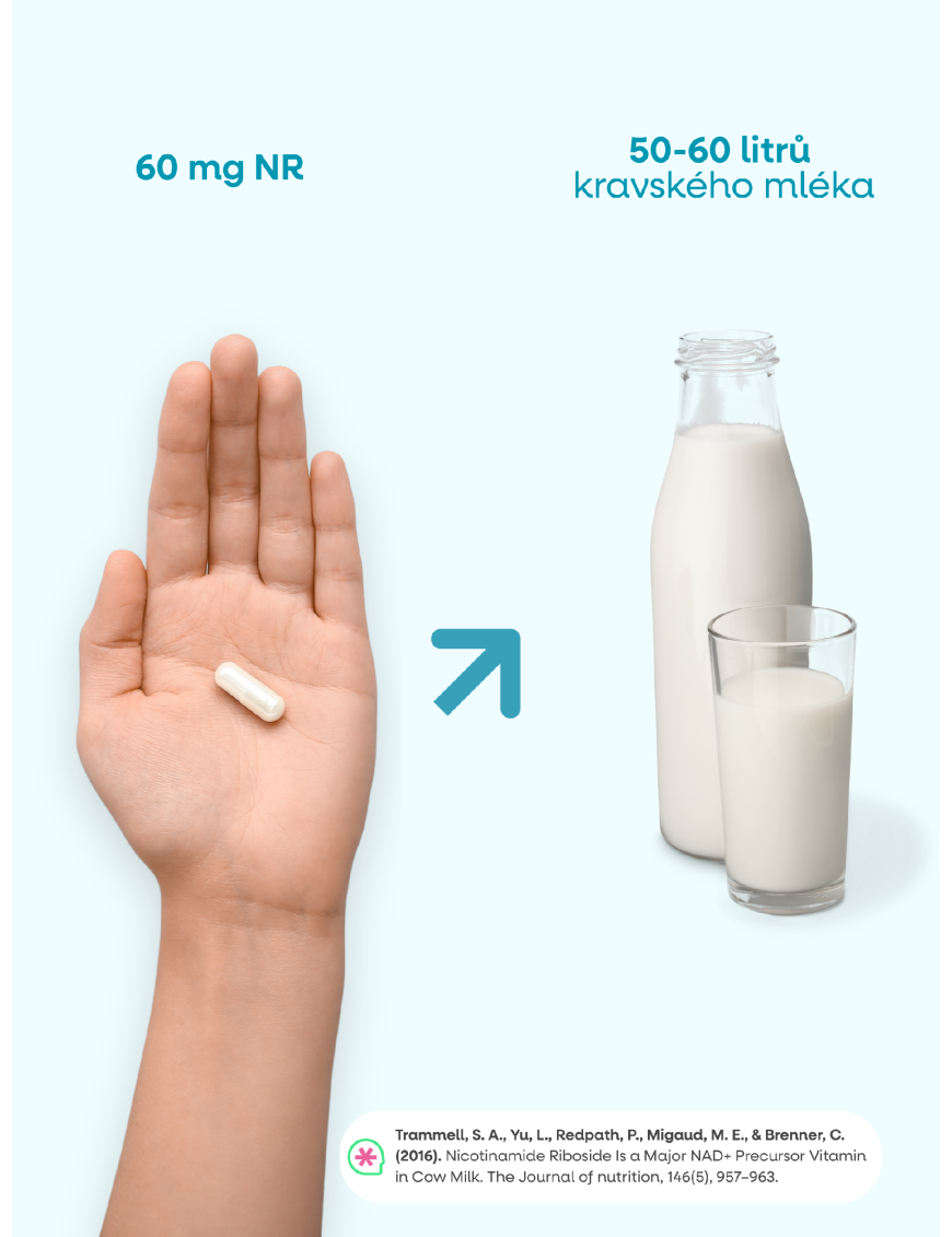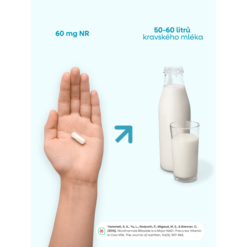 NR hraje klíčovou roli v energetickém metabolismu1. Kombinace s TMG a pterostilbenem (polyfenolem s vysokou biologickou dostupností) je cílená na optimalizaci metabolismu NAD+ a aktivaci sirtuinů. Dávka 300 mg odpovídá přibližně 100 mg niacinu. Oproti niacinu ale nezpůsobuje zarudnutí pokožky a je tak vhodný pro dlouhodobé užívání v rámci longevity protokolů.