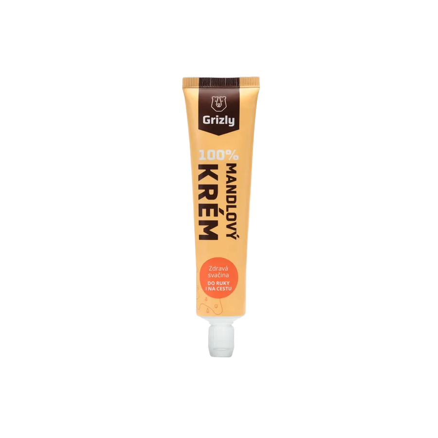 GRIZLY Mandlový krém v tubě 75 g. Vlastnosti a výhody: Mandlový krém je namletý do lahodné jemné konzistence a zabalený do praktické tuby vhodný na každodenní cesty za prací i zábavou. Mějte u sebe vždy svoji porci mandlového másla a dodejte tělu potřebnou jiskru pro vaši zdravou cestu životem. Celý výrobní proces, který zahrnuje výběr surovin, pražení na horkém vzduchu, mletí i balení do tub probíhá v naší výrobě, proto můžeme garantovat lahodnou chuť a poctivé suroviny v každém balení. Hlavní výhody mandlového krému v tubě:. Pohodlné a uzavíratelné balení Skvělá svačina v průběhu dne Vyvážená kombinace živin: 1 tuba obsahuje 16 g bílkovin, 16 g sacharidů, 39 g tuků a 8 g vlákniny Bez lepku / bez barviv a emulgátorů / bez cukru / bez palmového oleje Čerstvě vyrobeno v České republice Jemná textura Administrativní zařazení: Suché skořápkové plody. Složení: Pražené jemně mleté mandle natural 100 %. Země původu:  Česká republika. Skladování:  Skladujte na temném, chladném a suchém místě. Balení:  Znovuuzavíratelná tuba. Doporučujeme tubu před konzumací promačkat.