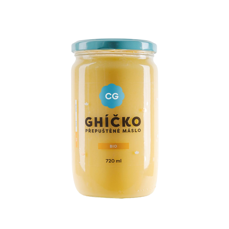Ghí, neboli přepuštěné máslo, je čistý máselný tuk vyrobený podle starodávné ajurvédské receptury. Odpařením vody a oddělením mléčné bílkoviny získáváme čistý tuk obsahující celou řadu vitamínů , minerálů a antioxidantů . A kvalitní české ghíčko poznáte tak, že má modré víčko.