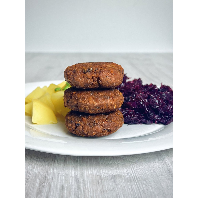 Složení: Hrachová bílkovina 66 %, lupínky z naklíčené fazole mungo sušené, zahušťovadlo (E461), aroma, mouka z klíčené fazole mungo, cibule restovaná (cibule 90 %, slunečnicový olej), olivový olej, mořská sůl, sušený česnek, psyllium, koncentát z červené řepy, karamelizovaný cukr.