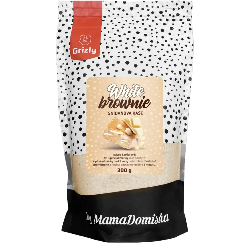 GRIZLY Kaše White brownie by @mamadomisha 300 g. Některá rána jsou skvělá a někdy se zase nemůžete dostat z postele. Vyzkoušejte instatní bezlepkovou kaši White brownie a bude se vám vstávat jedna radost. Grizly Tip : Kaše je moc dobrá jen tak samotná, a to nejen na snídani. Pro absolutně dokonalou chuť zkuste přidat čerstvé ovoce a lžičku oříškového krému White Brownie by @mamadomisha. Nezapomeňte vyzkoušet také další produkty by @mamadomisha Jak kaši připravit. Kaši nasypte do misky a zalijte dvojnásobným množstvím horké vody nebo mléka, tzn. na 60 g sypké směsi použijte alespoň 120 ml tekutin. Důkladně promíchejte a nechte odstát minimálně 3 minuty .