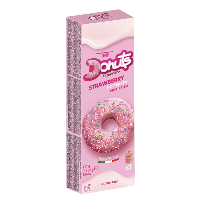 Italské donuty s jahodovou polevou jahoda bez lepku. Jsou pečené, nikoli smažené. V balení vždy po třech kusech, kdy každý je balený zvlášť. Výborné jako svačinka na výlety, do práce, pro děti do školy, ale i jako skvělý zákusek ke kávě či čaji.