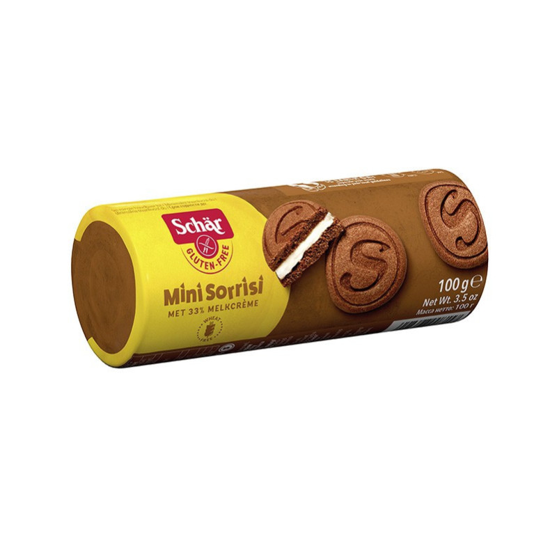 Kakaové bezlepkové sušenky Mini Sorrisi plněné mléčným krémem. Neobsahují lepek, pšenici, vejce a konzervanty.
