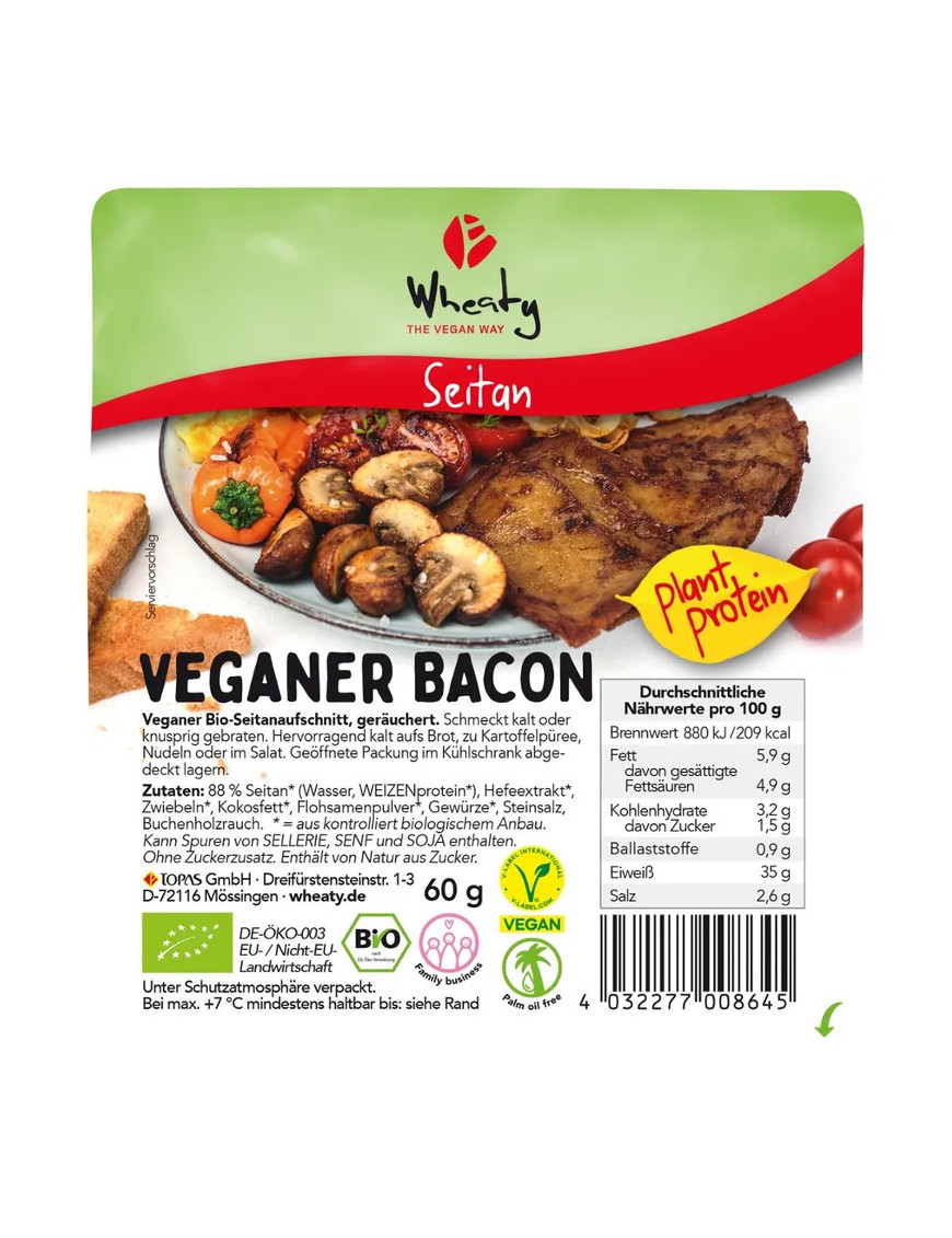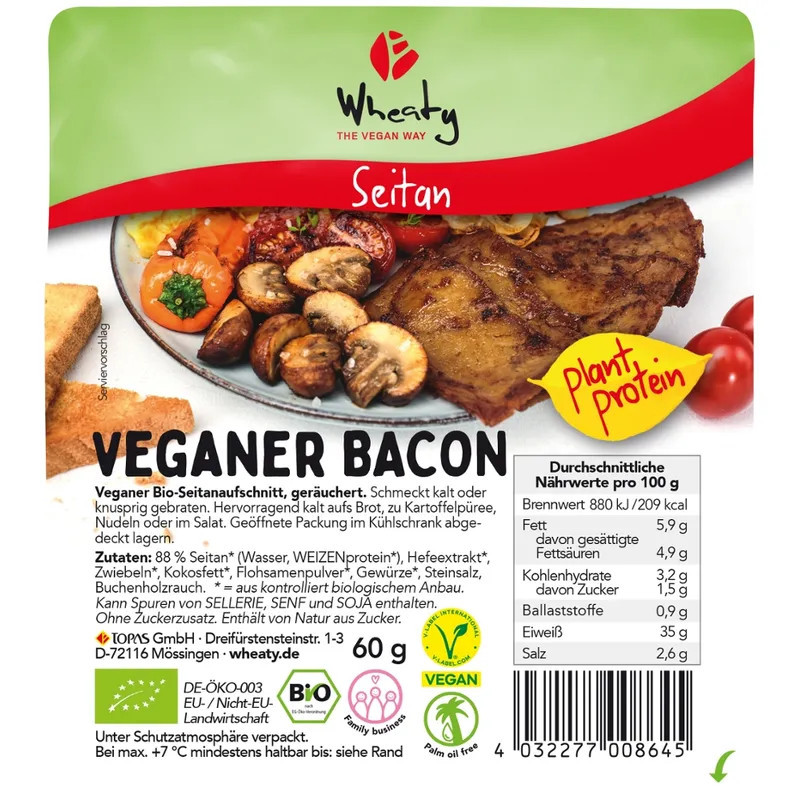 88 % seitanu* (voda, PŠENIČNÝ protein*), kvasnicový extrakt*, cibule*, kokosový tuk*, psyllium*, koření*, sůl, kouř z bukového dřeva.