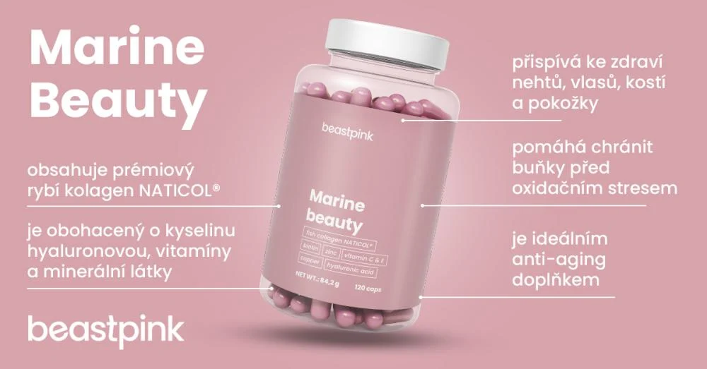 Marine Beauty je funkční komplex pro podporu ženského půvabu a celkové krásy. Základ tvoří prvotřídní rybí kolagen NATICOL®, který je zpracován maximálně šetrnými procesy, aby si zachoval nejvyšší možné množství blahodárných látek. Kolagen je hlavní strukturální protein, který najdeme například v kůži, chrupavkách, svalech či cévách. Je tak dobré tělu zajistit jeho optimální množství. S věkem totiž může množství kolagenu v těle přirozeně klesat, což se pak často projevuje například vyšším výskytem vrásek. Marine Beauty tak může být skvělým pomocníkem pro ty, kteří chtějí pokožce zajistit pevnost, pružnost i mladistvý vzhled. Jedná se tak o ideální anti-aging doplněk.