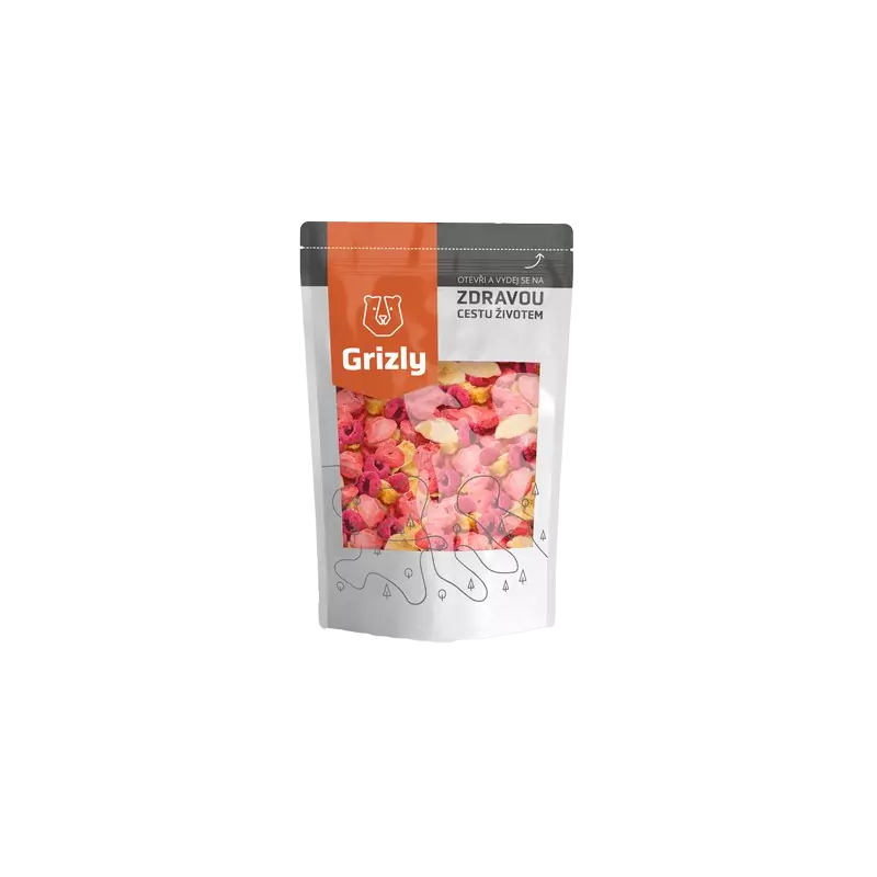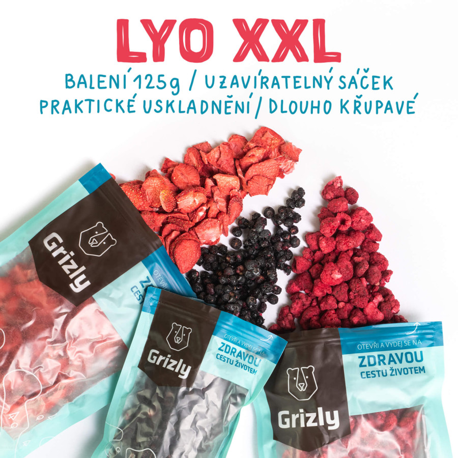 GRIZLY Lyo mix Šestka 125 g. Nemůžete se rozhodnout, na jaké lyofilizované ovoce máte zrovna chuť? Nevadí, přesně pro tyto případy jsme namíchali náš pestrobarevný Lyo mix Šestka! V jednom velkém balení najdete pěkně pohromadě rovnou šest druhů ovoce – lyofilizované jahody, maliny, mango, kousky mrazem sušeného ananasu, broskví a plátky lyo banánu. Zkrátka rozmanitá paleta chutí a vůní, kterou se vyplatí zařadit do jídelníčku. Obsahuje vitamíny a minerály. Navíc lyo mix krásně křupe, jelikož ho proces lyofilizace zbavil vody. A protože ho balíme do znovuuzavíratelného obalu, tuto vlastnost si uchová. Stejné XXL balení, v jakém je zabalena lyo šestka, najdete také u ostatního ovoce sušeného mrazem. Nemusíte se tak bát, že byste ho neměli dostatek. Můžete vyzkoušet třeba velké balení mrazem sušených malin, lyofilizovaných jahod nebo skvělé křupavé lyo švestky. Pro milovníky čokolády pak máme připravené lyofilizované ovoce v čokoládě. Jaké ovoce lyo mix obsahuje. jahody maliny mango ananas broskve banán Jak lyo šestku využít. Třeba jako svačinku během dne anebo k snídani jako součást kaš e. Pokud rádi trávíte čas v kuchyni, vyzkoušejte lyo šestku při tvorbě domácích moučníků, přidejte ji do granoly nebo pestrého smoothie. Záleží na vaší kulinářské fantazii. Proč chtít GRIZLY mix lyo ovoce:. šetrné sušení mrazem ideální volba pro nerozhodné praktické větší balení Věděli jste, že:. …lyofilizace je proces sušení hlubokým mrazem za velmi nízké teploty a tlaku? Dochází k vysušení přirozeně obsažené vody, proto je lyofilizované ovoce tak křupavé. Navíc si v maximální možné míře zachová svou původní barvu, chuť, vůni a všechny minerální látky a vitamíny. Plno zajímavostí o mrazem sušeném ovoci najdete v našem článku. Tak si ho neváhejte přečíst.