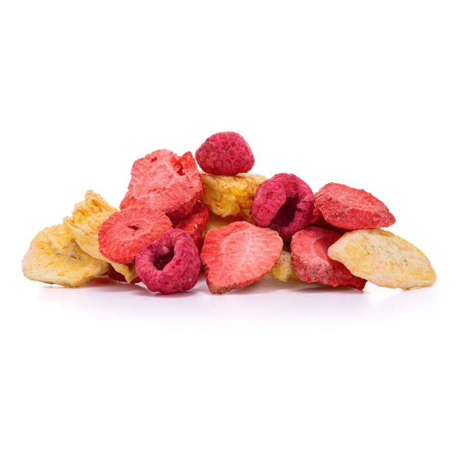 Pestrobarevnou směs křupavého mrazem sušeného ovoce tvoří jahody, maliny, kousky lyo ananasu, broskví, manga a plátky lyo banánu. Potěšení pro vaše chuťové buňky ve větším znovuuzavíratelném balení.