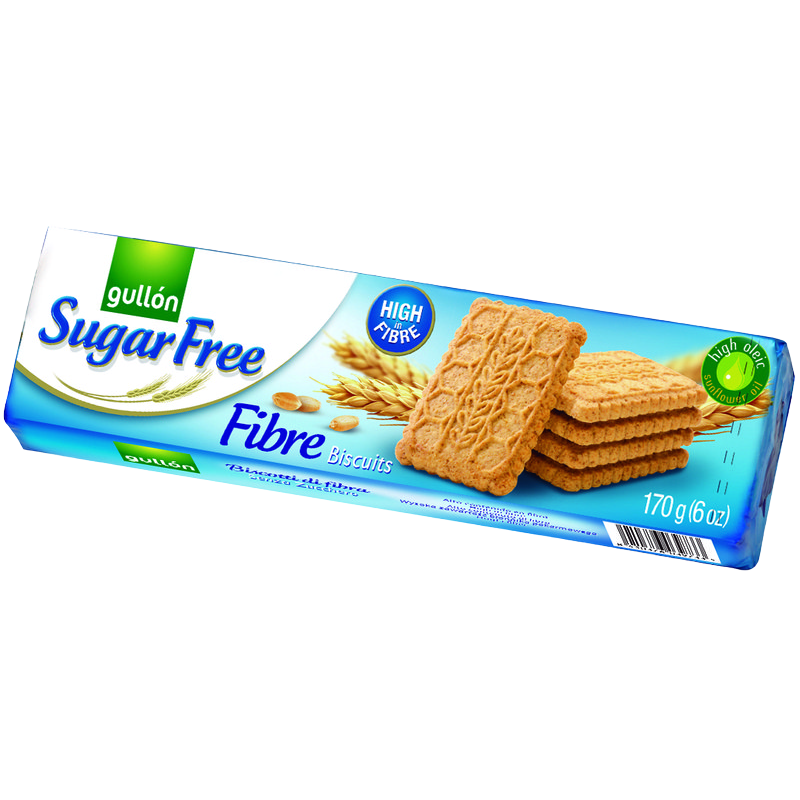 Gullón Fibre sušenky s vlákninou, bez cukru 170 g. Oplatky s velmi kvalitními sladidly, bez přidaného cukru, které mají vysoký obsah vlákniny. Jsou jako skvělá svačinka pro ty, kteří si chtějí pochutnat, ale přitom se i zdravěji stravovat a také snížit příjem cukru. Složení: Celozrnná pšeničná mouka 57,5 %, sladidlo (maltitol), rostlinný olej (slunečnicový olej), 16,5 %, rostlinná vláknina 3,7 %,, vláknina z hrachu 3,5 %, kypřicí látky (hydrogenuhličitan sodný, hydrogenuhličitan amonný), emulgátor ( sójový lecitin ), jedlá sůl, aromata. Může obsahovat mléko. Výrobek se sladidly. Země původu: Španělsko