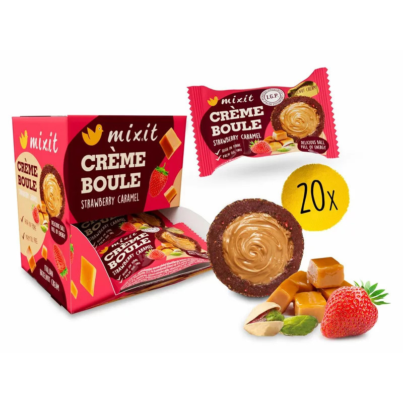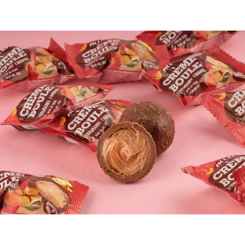 Tahle koule vám při mlsání udělá jednoduše boule až za ušima, o to se postará chuťová harmonie datlí, karamelu, jahod a jemně nasekaných pistácií bez palmového oleje a bez zbytečných umělých přísad a chemie.  Crème boule jsou dokonalým zdrojem rychlého a nebesky dobré energie, kterou můžete mít vždy po ruce.