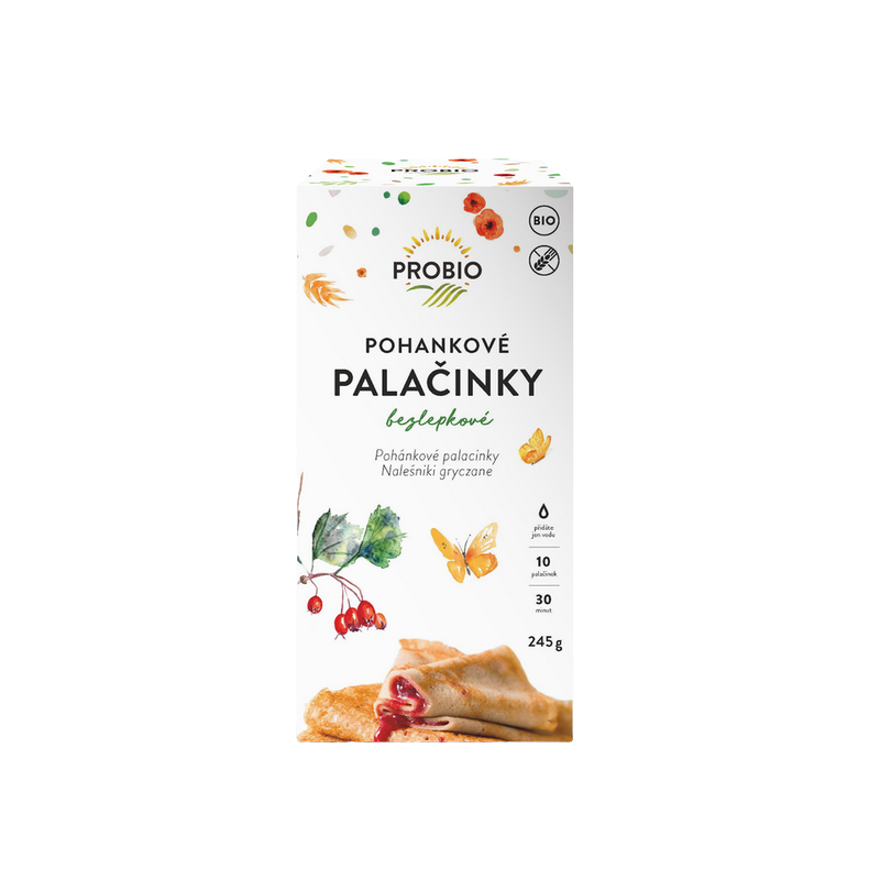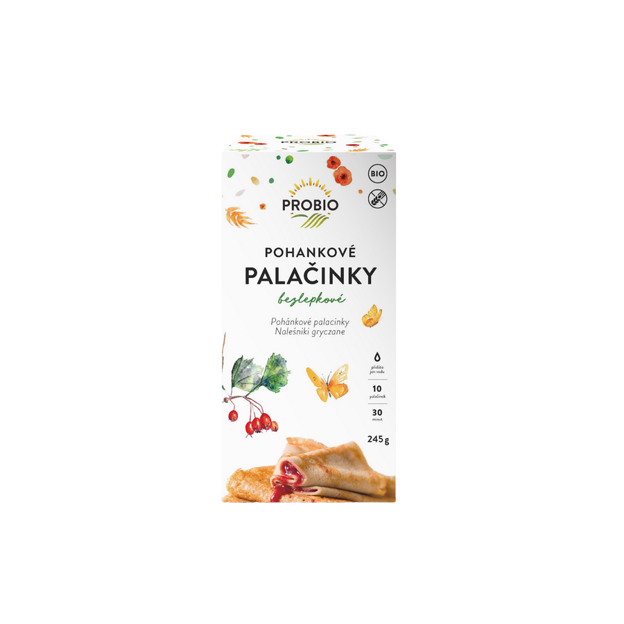 Pohankové palačinky, stejně jako ječné lívance nechybí na žádné PROBIO akci. Jsou z kvalitní pohankové mouky, kterou meleme u nás v bezlepkovém mlýně. Pohanka je nutričně bohatá, má vysoký obsah vlákniny, bílkovin a rutinu. Působí příznivě na cevní soustavu a imunitu. Pohankové palačinky jsou tak tipem na výbornou snídani, oběd i večeři.