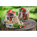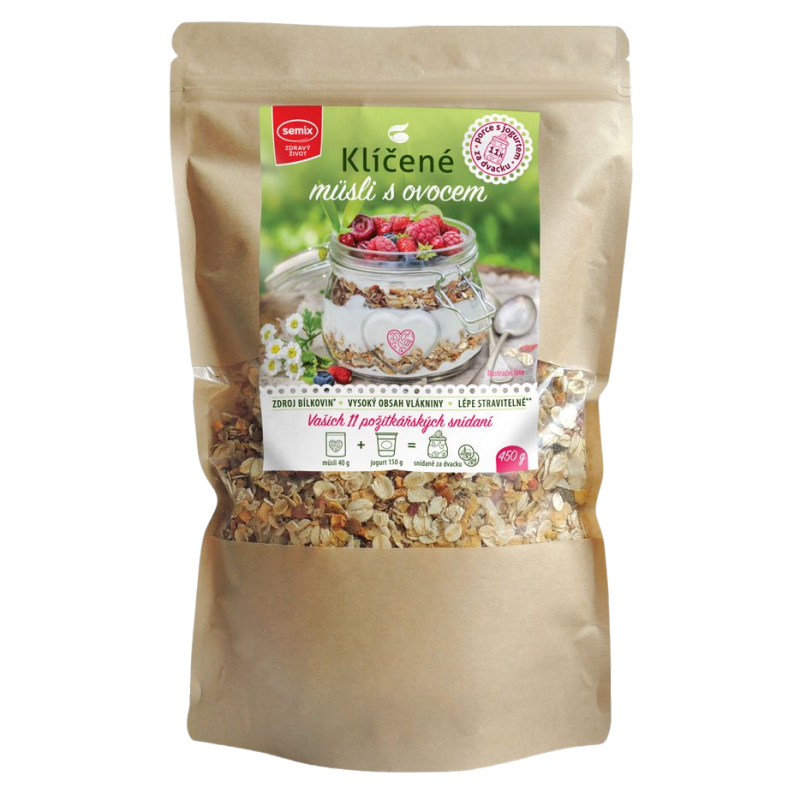 Semix Klíčené müsli s ovocem bez lepku 450 g. Vlastnosti a výhody: Klíčení je proces, který má za úkol poskytnout dostatek živin rostoucímu organismu - klíčku. V zrnu po jeho namočení začne probíhat kaskáda biochemických reakcí - ve vnitřní části zrna postupně dochází ke štěpení škrobů, bílkovin a tuků. Naklíčené zrno je díky tomu lépe stravitelné ve srovnání se zrnem nenaklíčeným. Toto müsli je tak pro tělo lépe stravitelné a zároveň bohaté na bílkoviny a vlákninu. Příprava: Večer než půjdete spát, připravte si širokou sklenici (případně hrneček nebo misku). Na dno dejte 2 lžíce jogurtu či zakysané smetany, přidejte 1 vrchovatou polévkovou lžíci Klíčeného müsli, opět přidejte lžíci jogurtu a takto 4x zopakujte, dokud nenaplníte sklenici. Sklenici poté zavíčkujte, přiklopte malým talířkem či zatáhněte potravinářskou folií. Dejte na noc do lednice. Ingredience se přes noc pěkně spojí, müsli změkne a nasaje jogurt. Složení : Naklíčené lupínky a vločky sušené v různém poměru 59 % (lupínky z naklíčené pohanky sušené, vločky z naklíčeného ovsa bez lepku sušené*, lupínky z naklíčené červené quinoy sušené, lupínky z naklíčené červené čočky sušené), ovoce v různém poměru 25 % (papája (papája 50 %, cukr, konzervant ( oxid siřičitý )), sušená jablka, kustovnice), drcené kukuřičné lupínky (kukuřice 95 %, cukr, sůl), dýňové semínko, kokosové plátky. Může obsahovat stopy sóji, skořápkových plodů, mléka a sezamu. Skladování: Skladujte v chladném, temném a suchém místě.