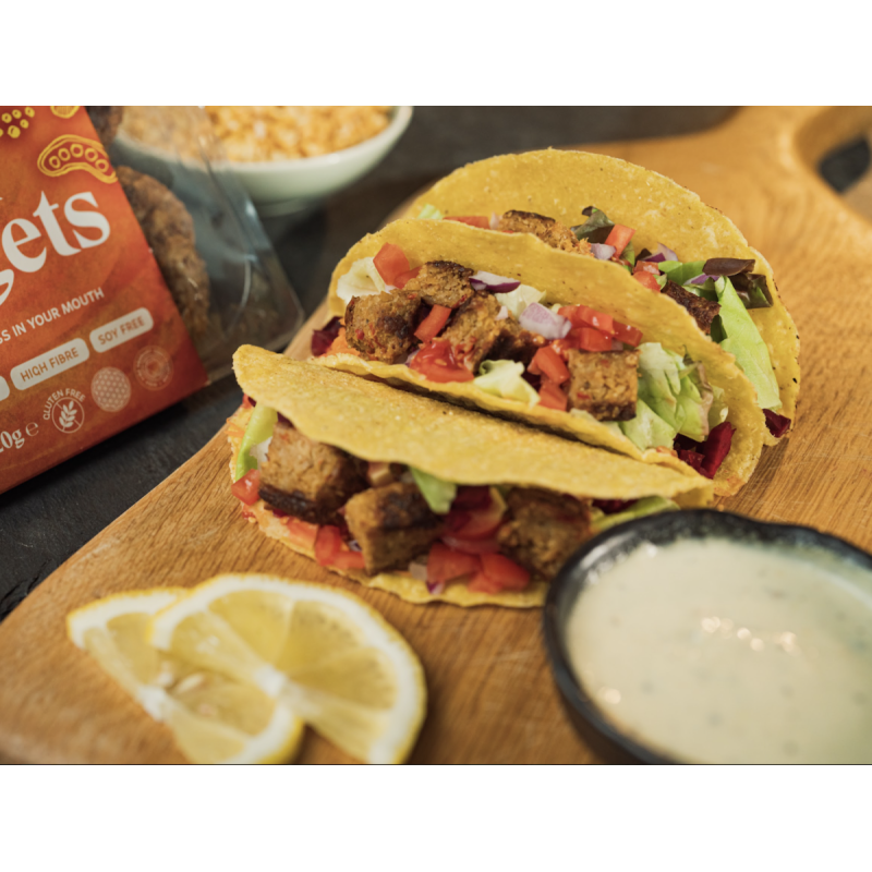 Ingredients: cooked yellow peas* (20%) cooked beans* (20%) mushrooms* (20%) potatoes* gluten-free oat flakes* sun-dried tomatoes*, soy), water, rapeseed oil*, lemon juice*, chia seeds*, garlic powder*, psyllium*