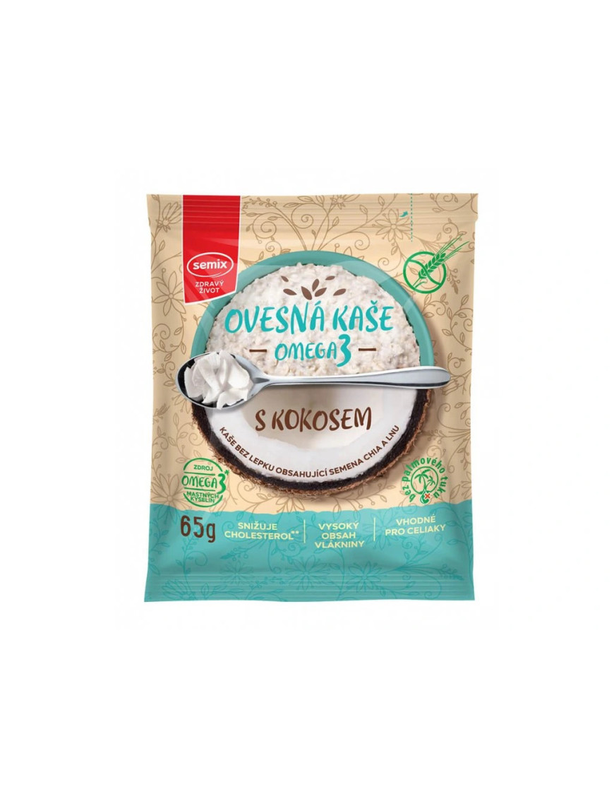 The unique gluten-free oatmeal with coconut contains 2.8 g of alpha-linolenic acid (from the omega-3 fatty acid family) in 100 g, which contributes to the maintenance of normal blood cholesterol levels. The beneficial effect is achieved with a daily intake of 2 g of this acid. Contains chia and flax seeds. It has a high fibre content.
