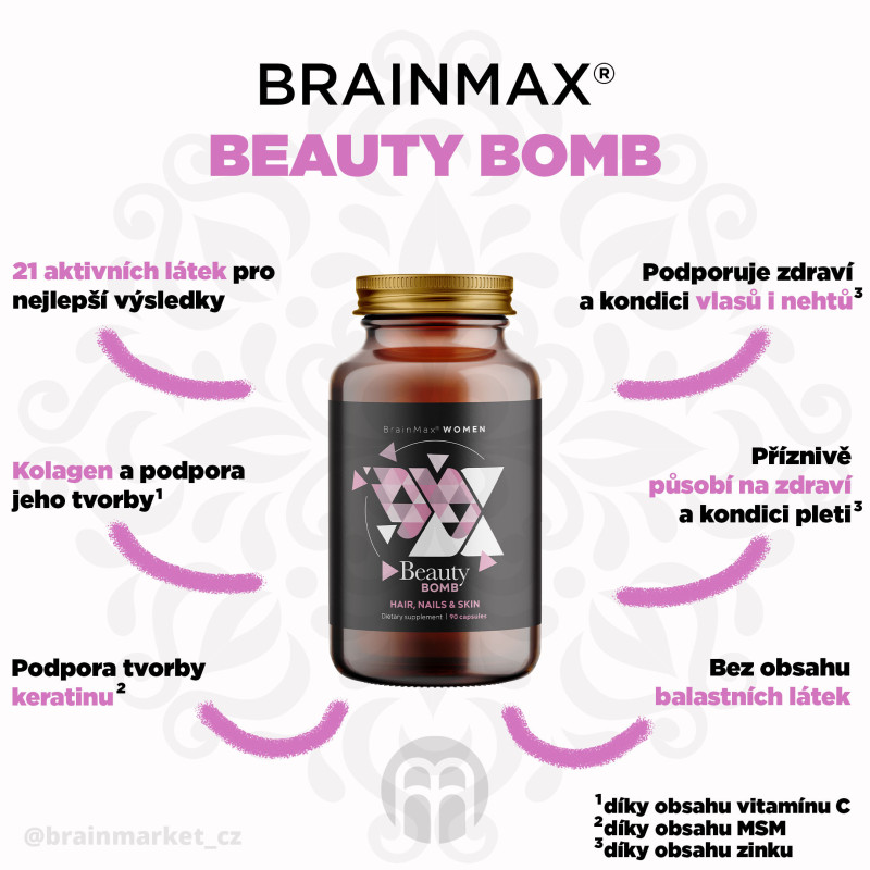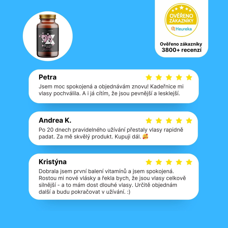 Poor condition of hair, nails or skin can be caused by mineral and vitamin malnutrition, stress, toxins or hormonal fluctuations. It is therefore advisable to supplement nutrients also through dietary supplements. BEAUTY BOMB is suitable for individuals dealing with: