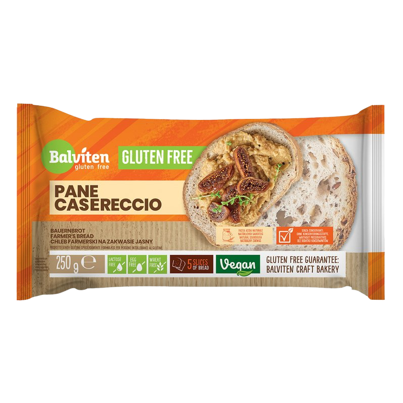 Balviten Gluten-free Farmhouse Bread 250 g Sliced, gluten-free and very tasty Farmhouse Bread Ingredients: water, corn starch, natural sour dough 19 %: Rice flour, water; buckwheat flour, invert sugar syrup, rice flour, apple fibre, rice starch, rapeseed oil, soya protein, sugar, salt, thickener: hydroxypropylmethylcellulose; yeast, apple extract, pea fibre. Farmhouse bread.