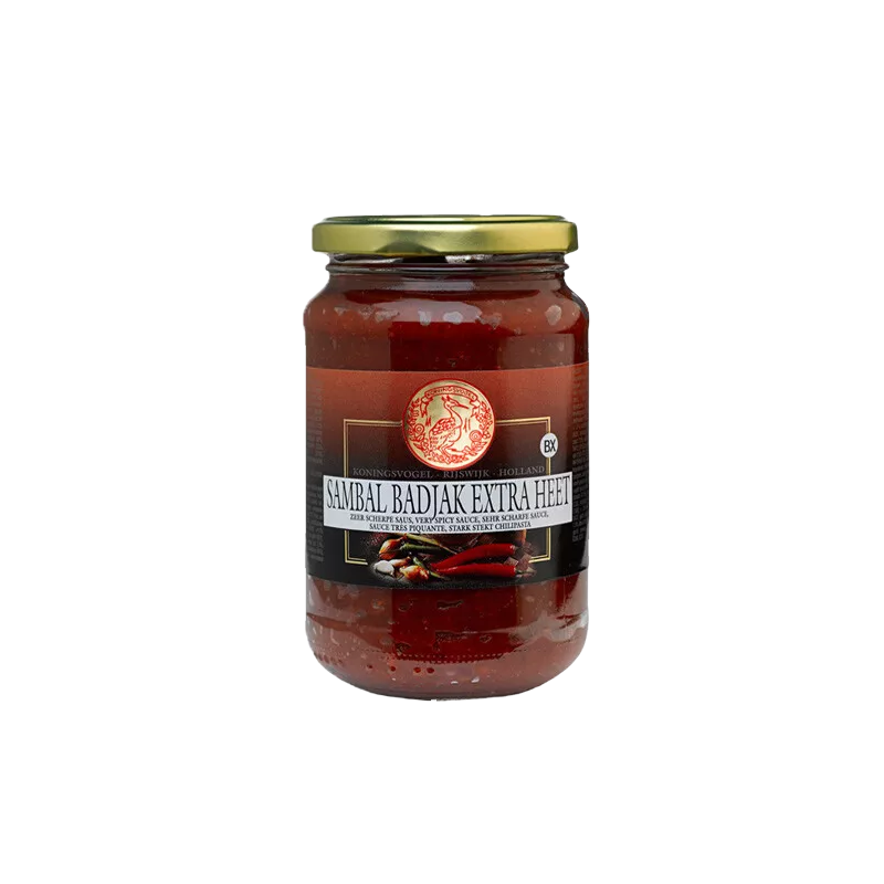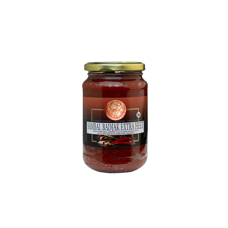 Sambal Badjak Extra Heet is an intensely spicy Indonesian paste made from finely ground chillies, onions, garlic and other spices. This traditional blend offers a distinctive flavour and aroma that will give your dishes an authentic Asian twist. Ideal for lovers of really spicy food, Sambal Badjak is great as a dip, marinade or as an ingredient in sauces and soups. Thanks to its concentrated form, you only need to use a small amount to achieve the desired spiciness. Enliven your culinary creations with this exceptional product straight from Indonesia!
