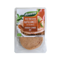 Lyoner with peppers is a vegetarian sausage made from organic ingredients, enriched with pieces of red and green peppers. Mildly spicy and versatile, ideal for baking or cold cooking.