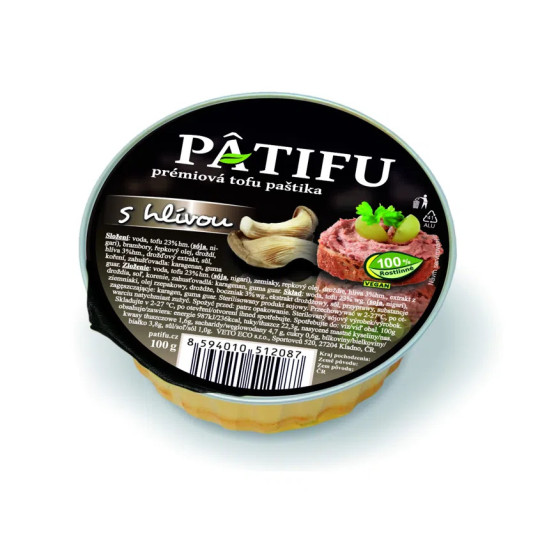 VETO ECO Paštika PATIFU s hlívou 100 g Vlastnosti a výhody: Výborná tofu paštika, která má jemné složení a vyváženou chuť. Téměř nepoznáte rozdíl od masové. Je v praktickém alu balení, takže se velmi dobře otvírá i dávkuje a díky sterilování během výroby má dlouhou trvanlivost, aniž by musela být v chladu. Je to tedy i skvělá volba na výlety. Použití: Paštika je dobrá nejen s pečivem, ale na kukuřičném chlebu nebo knäckebrotu. Složení: Voda, tofu 23 % (soja, nigari), brambory, řepkový olej, droždí, hlíva 3 %, drožďový extrakt, sůl, koření, zahušťovadla: karagenan, guma guar. Skladování: Skladujte v temném, chladném a suchém místě. Po otevření skladujte v lednici. Balení: ALU obal. Lahodná tofu paštika Patifu s hlívou je zdravá svačinka, která je vhodná i pro vegetariány, vegany a příznivce zdravého životního stylu.