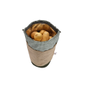 Saco de patatas de diseño exclusivo de tres capas con capacidad para 2,5 kg de patatas. La capa exterior está hecha de una combinación de tela de algodón y yute, y la inferior es de tela sólida impermeable. La capa intermedia está hecha de una tela no tejida oscura que es transpirable, extraíble y no transmite la luz. La capa interior contiene papel de aluminio, que mantiene suficiente humedad y una atmósfera protectora en el interior. El Zembag se cierra tirando del cordón.