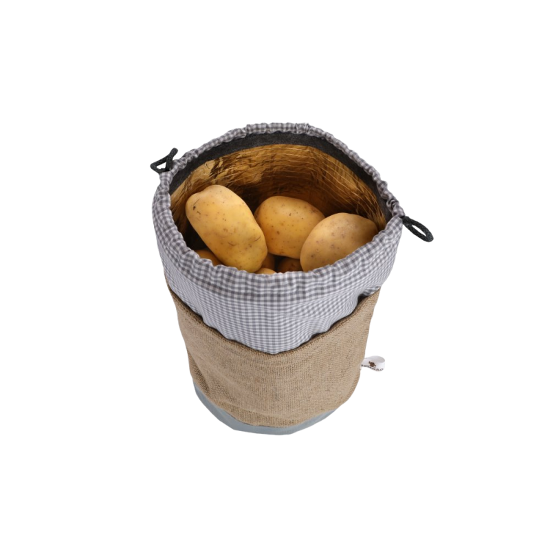 Saco de patatas de diseño exclusivo de tres capas con capacidad para 2,5 kg de patatas. La capa exterior está hecha de una combinación de tela de algodón y yute, y la inferior es de tela sólida impermeable. La capa intermedia está hecha de una tela no tejida oscura que es transpirable, extraíble y no transmite la luz. La capa interior contiene papel de aluminio, que mantiene suficiente humedad y una atmósfera protectora en el interior. El Zembag se cierra tirando del cordón.