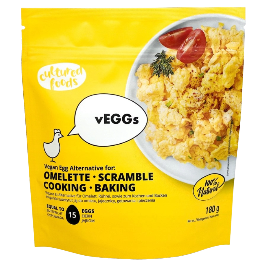 Para preparar un huevo vegano: mezclar bien 12 g de vEGGs en polvo (22 ml), 2 cucharadas y media de agua (37 ml/37 g), media cucharadita de aceite y mezclar bien.