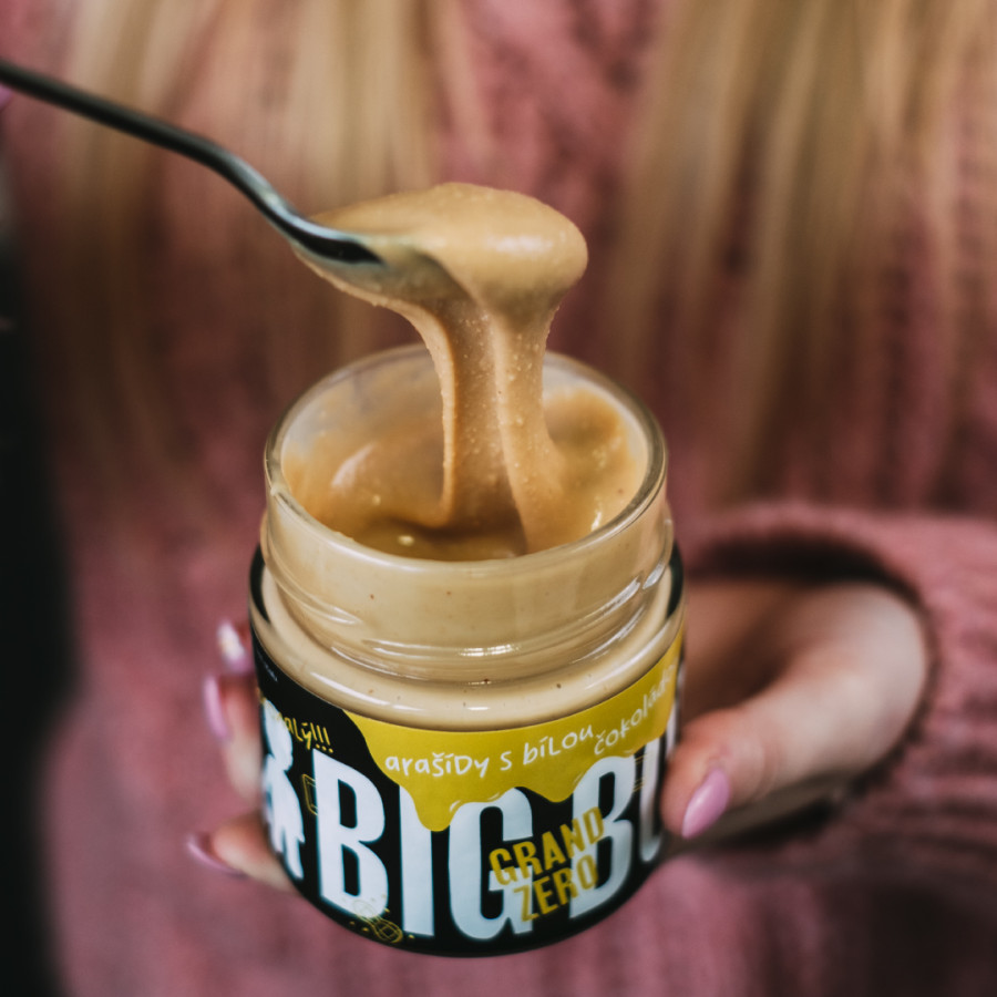 Además, la crema tiene una consistencia suave y un contenido equilibrado de proteínas, hidratos de carbono y grasas saludables que nuestro organismo necesita. BIG BOY Grand Zero con chocolate blanco en puntos: crema de cacahuete con chocolate blanco belga sin azúcares añadidos consistencia cremosa contenido equilibrado de macronutrientes
