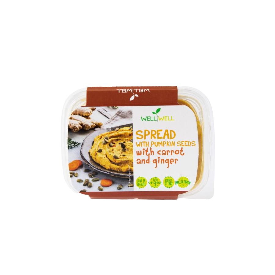 La pasta vegetal para untar con pipas de calabaza, mcrea y jengibre es baja en azúcar y fuente de proteínas y fibra.