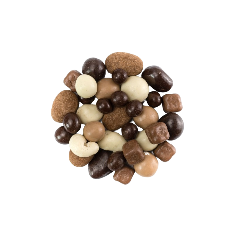 Presentamos una exclusiva mezcla de chocolate que ofrece una irresistible combinación de sabores y texturas. Nuestros ingredientes cuidadosamente seleccionados incluyen cerezas cubiertas de chocolate negro, granos de café, coco, avellanas, anacardos en yogur y almendras cubiertas de chocolate con leche y canela.