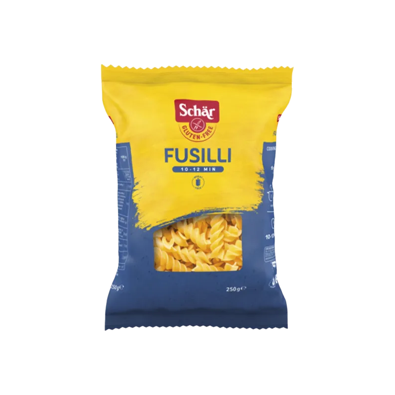 Los Fusilli sin gluten Schär están elaborados con harina de maíz y arroz sin gluten y pueden incluirse en la dieta de celíacos y otras personas que necesiten ajustar su alimentación. No contienen huevo ni lactosa y son adecuados como acompañamiento de salsas, ensaladas y cocina tradicional italiana.