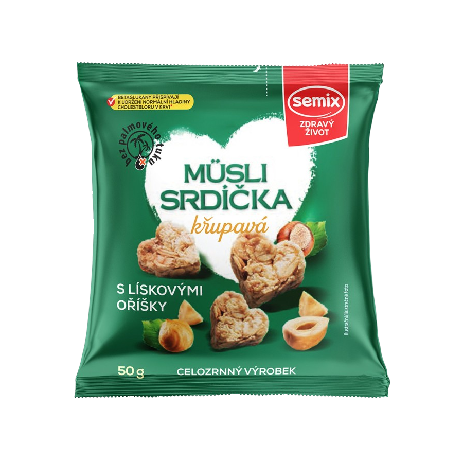Semix produce para usted corazones de muesli con una tecnología de producción única. Son adecuados como tentempié para adultos y niños. Tienen un alto contenido en fibra natural (3,3 g por ración de 50 g) y contienen betaglucanos, que contribuyen a mantener niveles normales de colesterol en sangre. Para conseguir el efecto deseado, deben tomarse 3 g de betaglucanos al día. Recuerde seguir los principios básicos de un estilo de vida saludable y consumir una dieta sana y equilibrada. El producto contiene 1,4 g de betaglucanos por porción (50 g).