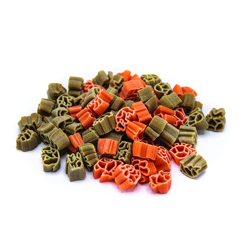 La pasta bicolor está hecha a base de harina de lentejas rojas y harina de guisantes verdes. La pasta es nutricionalmente muy rica, aporta energía y repone proteínas vegetales y fibra. Además, no contienen gluten por naturaleza. Deleite a sus hijos con lo mejor.