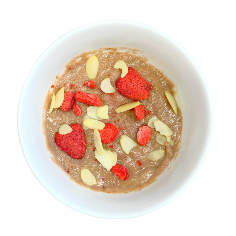 Ingredientes: leche de coco, harina de linaza dorada, harina de almendra, inulina, eritritol, harina de coco, fresa liofilizada en polvo.