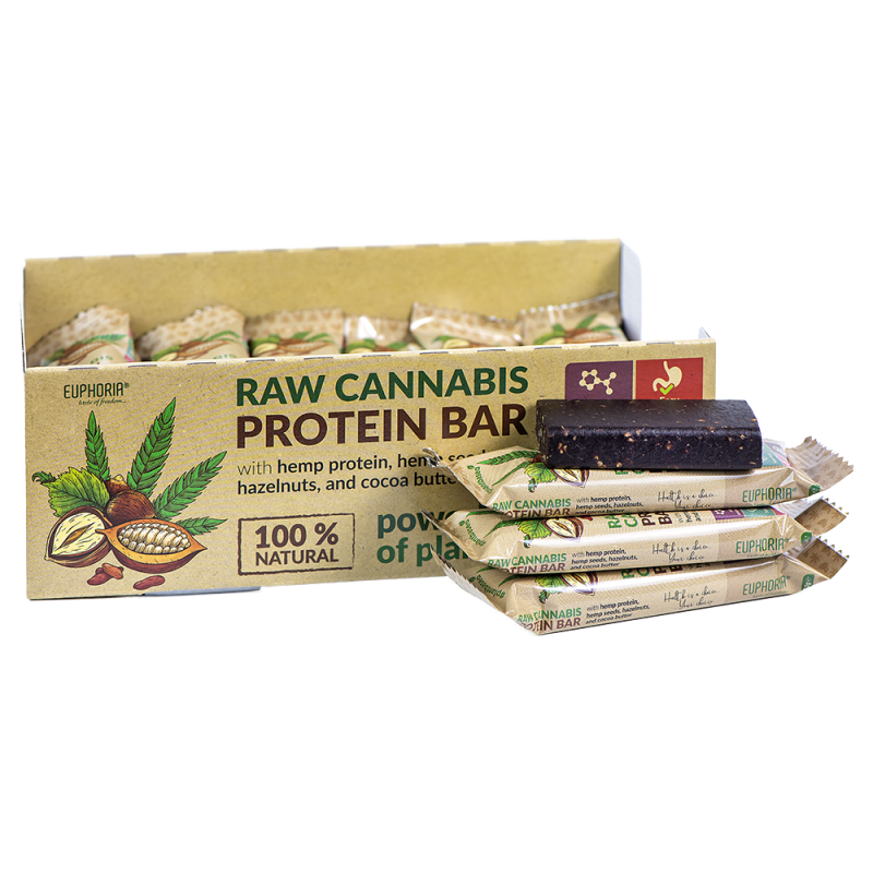 La BARRA DE PROTEÍNA DE CÁÑAMO EUPHORIA RAW CANNABIS PROTEIN BAR no sólo es "supernutritiva", sino también una lujosa variación de sabor a avellanas tostadas, semillas de cáñamo sin cáscara y fina manteca de cacao. Una deliciosa golosina y un tentempié saludable en uno, está literalmente repleta de proteínas, grasas saludables y energía. Si su cuerpo necesita reponer calorías después de hacer deporte o de un duro día de trabajo, ¡esta barrita de cáñamo es justo lo que necesita! La PROTEÍNA CRUDA extra fuerte de cáñamo tiene un gran perfil nutricional. Contiene los 20 aminoácidos y grasas saludables. Es fácil de digerir, no contiene gluten y es apta para veganos.