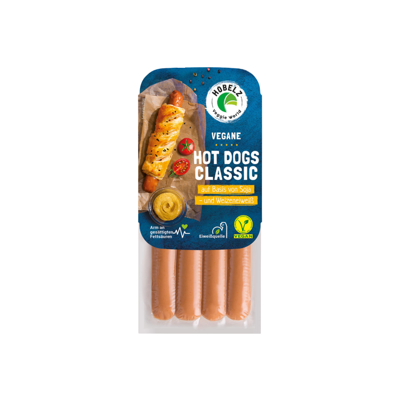 Salchichas para perritos calientes klasik Ingredientes: agua, 11% de proteína de soja aislada, aceite de colza, proteína de trigo(gluten), almidón de maíz modificado, sal, aroma, especias, fibra de cítricos, gelificante carragenano, extractos de especias, humo Instrucciones de conservación y uso: conservar en frigorífico a +2 - +8 °C Caducidad mínima: véase envase del fabricante.