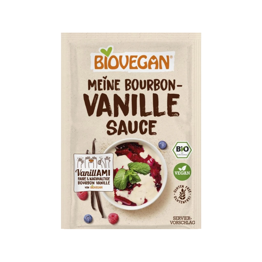 La salsa de vainilla con vainilla Bourbon es ideal para el strudel de manzana, el helado o la fruta fresca. Se prepara fácilmente mezclando el polvo con una bebida vegetal y azúcar de caña, tibia o fría, según sus preferencias.