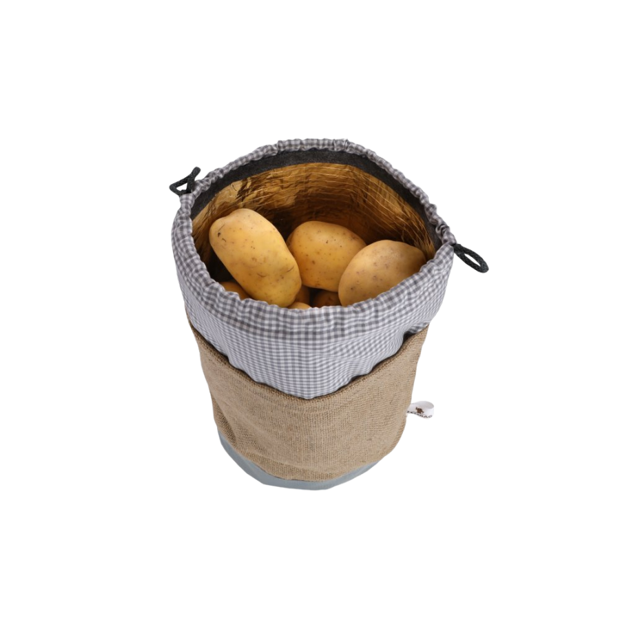 Saco de batata com um design único de três camadas, com capacidade para 2,5 kg de batatas. A camada exterior é feita de uma combinação de tecido de algodão e juta, o fundo é feito de tecido sólido impermeável. A camada intermédia é feita de um tecido não tecido escuro que é respirável, amovível e não transmite luz. A camada interior contém uma folha de alumínio, que mantém uma humidade suficiente e uma atmosfera protetora no interior. O Zembag fecha-se puxando o cordão.