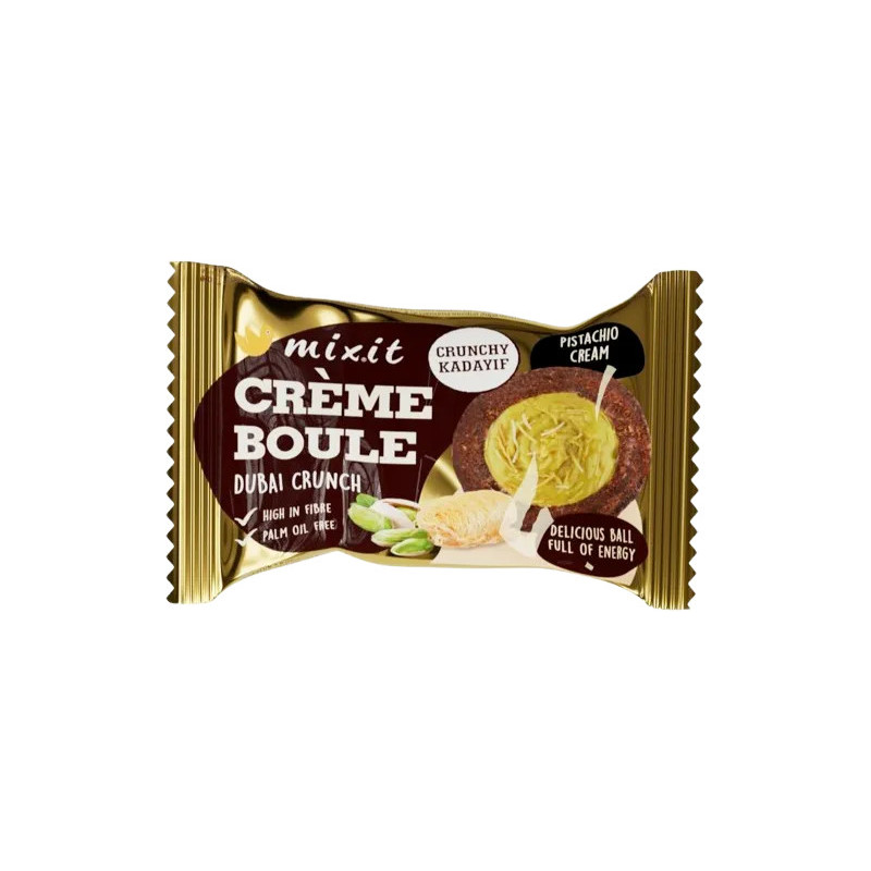 Dubajská čokoláda dobývá svět a my jsme její úžasnou náplň jednoduše skryli do našich Crème boulí. Tyto krémové koule jsou ódou na jedinečné spojení sladkých datlí, kvalitního kakaa Single Origin z Peru, delikátních pistácií a kataifi. Každé koule skrývá sametově jemný krém z pistácií s křupavým kataifi, který je zahalený v lahodné vrstvě datlí s kakaem.Co je Kataifi nebo též Kadayif? Jedná se o velmi tenké těstovinové nitky, které jsou známé v arabském světě pro jejich nezaměnitelnou křupavost.Dokonalý zdroj rychlé a nebesky dobré energie, kterou můžete mít vždy po ruce.Krém z pistácií a kataifi inspirovaný trendem dubajské čokolády.Jako vždy bez palmového oleje.