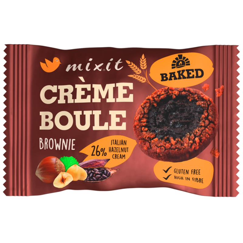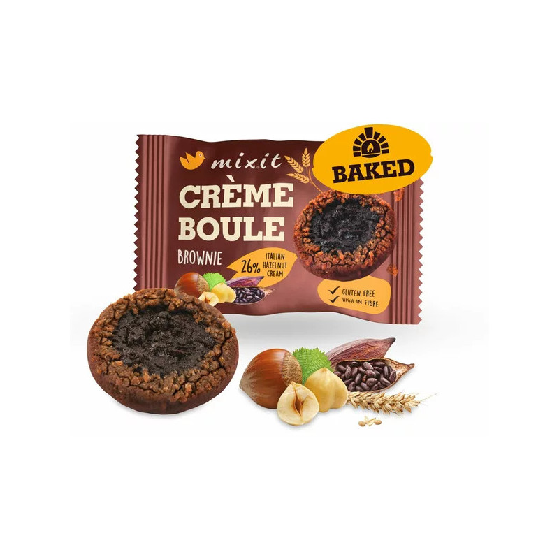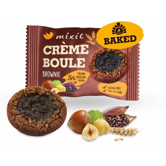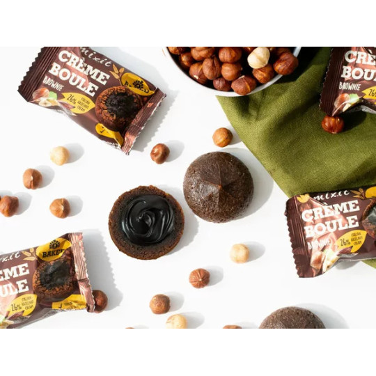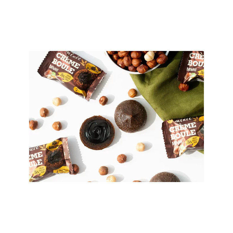 Pečená Crème boule? Ano a rozhodně vás nechceme vypéct. Jen jsme vám upekli novou dobrotu! Seznamte se s naší první pečenou Crème boulí, která chutná jako oblíbený čokoládový dezert a rozplývá se na jazyku. Vláčné bezlepkové těsto z kešu ořechů a lískooříškového krému skrývá jemnou a lahodnou náplň z těch nejlepších lískových oříšků na světe z italského regionu Piemont. Výsledkem je jednoporcové brownie, které můžete mít vždy při sobě. Crème boule voní po čokoládě a oříšcích a jedno je jisté - u jedné nezůstanete.bez palmového oleje a lepku26 % tvoří lískooříškový krém vysoký obsah vlákniny