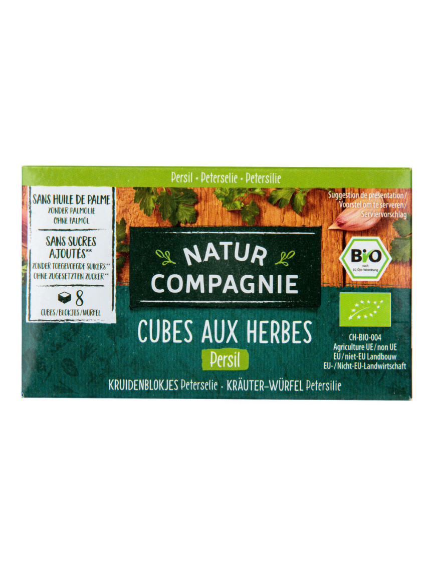 Natur Compagnie Bujon bylinkový kostky petržel BIO 80 g Stačí rozpustit ve vodě nebo smetaně a před koncem vaření zamíchat do připravovaného jídla. Vyvážená směs bylinek dodává svou jedinečnou chuť a vůni. V bio kvalitě. Je bez lepku, takže ho mohou bez obav na vaření používat i celiaci. Nejlépe si zachová svou chuť, když ho přidáte do jídla až před koncem vaření. Neobsahuje přidaný izolovaný glutamát sodný. Složení: Jedlá mořská sůl, bambucké máslo*, sušená syrovátka*, kukuřičný škrob*, petržel* 7,5 %, slunečnicový olej*, česnek*, listy celeru*, libeček* 0,5 %, kurkuma*. Může obsahovat stopy lepku, sóji, hořčice a vajec. *produkt kontrolovaného ekologického zemědělství Bylinkové kostky s petrželí k ochucení vašich pokrmů.