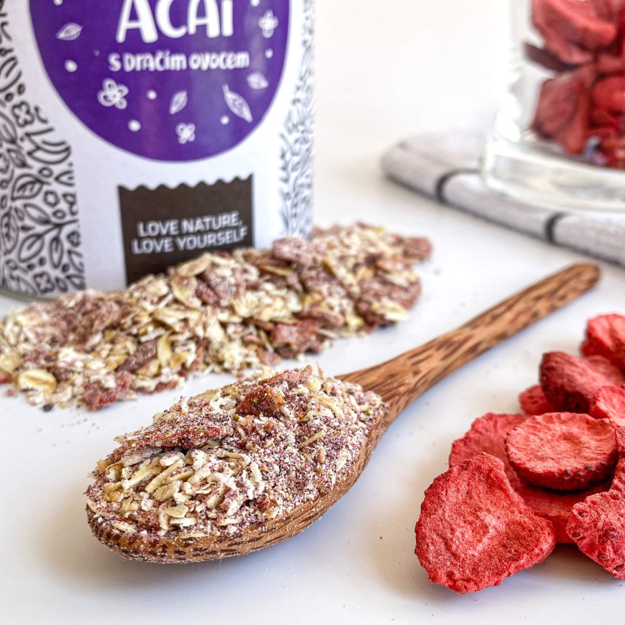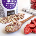 Ingredientes: aveia sem glúten, coco ralado, farinha de noz de tigre, 8% de morangos liofilizados, 4% de fruta do dragão liofilizada em pó, 3% de açaí em pó.