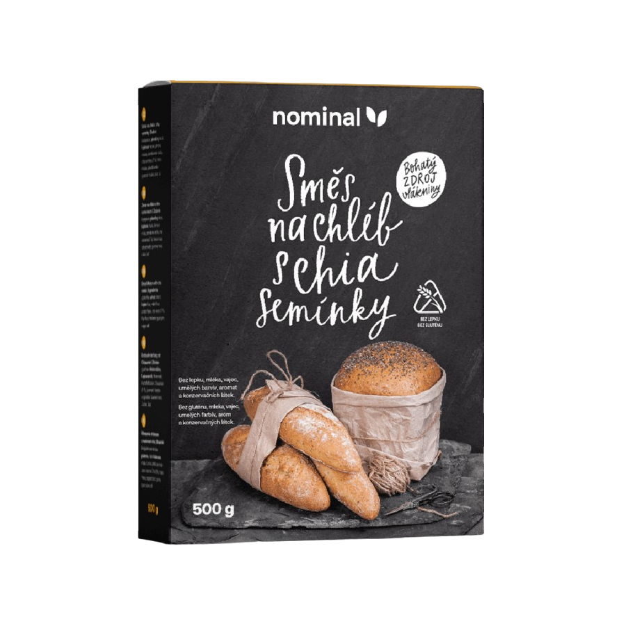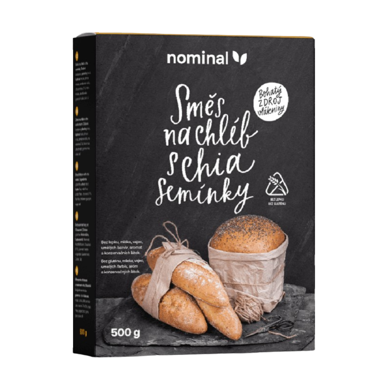 Será recompensado com pão fresco, quente, perfumado e húmido, que não só irá apreciar, como também fará algo pela sua saúde. É rico em fibras e adequado para uma dieta sem glúten. As misturas de massa da marca checa Nominal são feitas com ingredientes sem glúten de alta qualidade, sem corantes e aromas artificiais, e podem ser preparadas por qualquer pessoa!