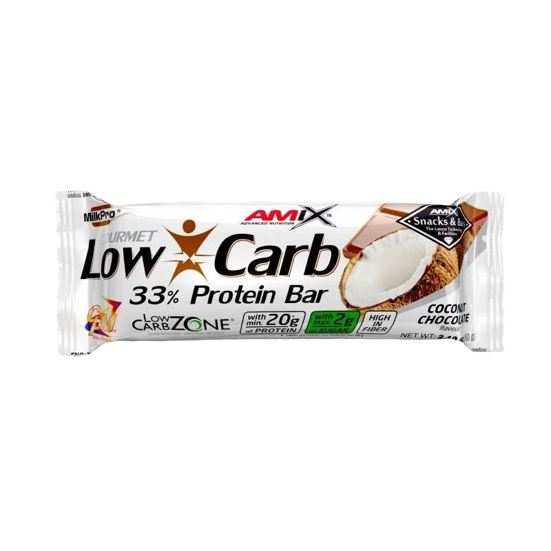 Low-Carb 33% Protein Bar é uma barra adocicada, pobre em hidratos de carbono (especialmente açúcares) e rica em proteínas.