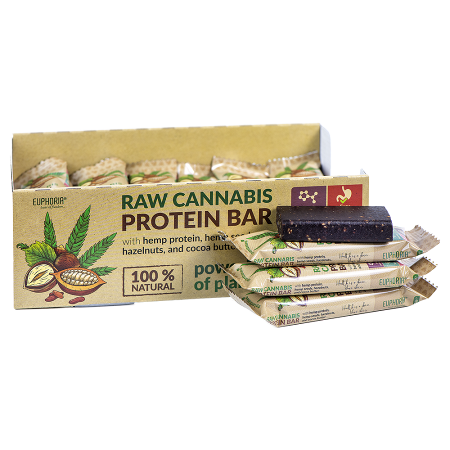 A barra de proteínas de cânhamo EUPHORIA RAW CANNABIS PROTEIN BAR não é apenas "super nutritiva", mas também uma luxuosa variação de sabor de avelãs torradas, sementes de cânhamo sem casca e manteiga de cacau fina. Uma guloseima deliciosa e um snack saudável num só, está literalmente repleta de proteínas, gorduras saudáveis e energia. Se o seu corpo precisa de repor calorias depois de praticar desporto ou de um dia de trabalho duro, esta barra de cânhamo é a coisa certa! A PROTEÍNA RAW de cânhamo extra forte tem um ótimo perfil nutricional. Contém todos os 20 aminoácidos e gorduras saudáveis. É de fácil digestão, sem glúten e adequada para veganos.